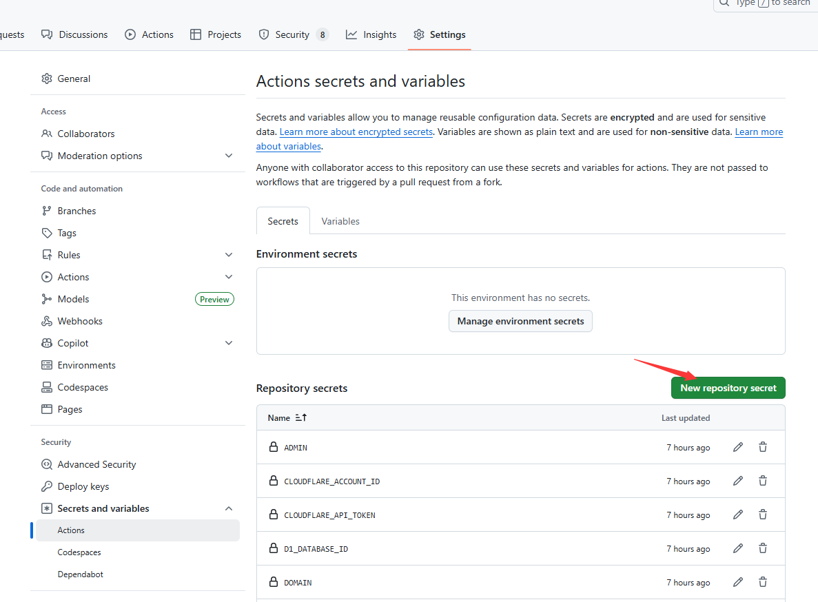 - 进入您的 GitHub 仓库设置, 添加以下 Secrets