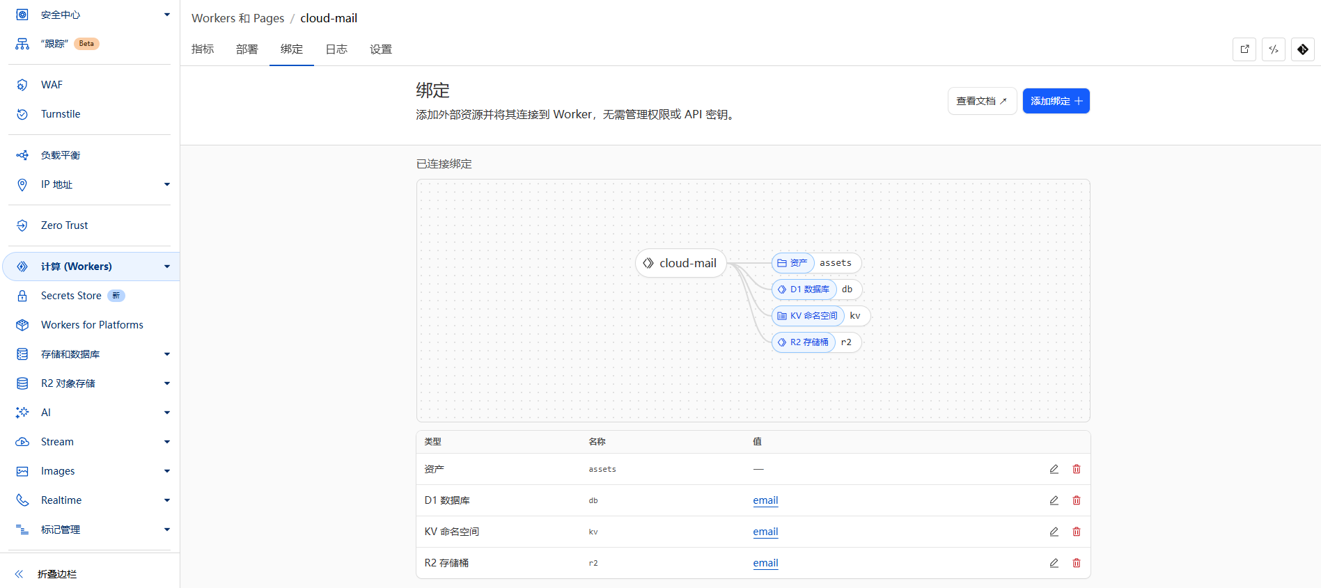 回到worker设置界面绑定刚刚创建的数据库 d1数据库 变量名为 db kv数据库 变量名为 kv