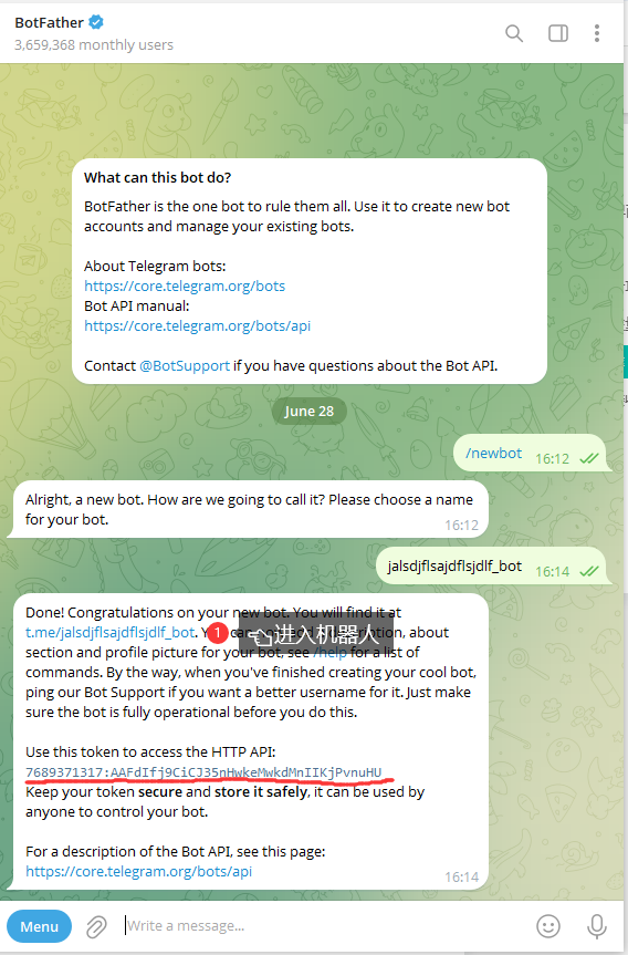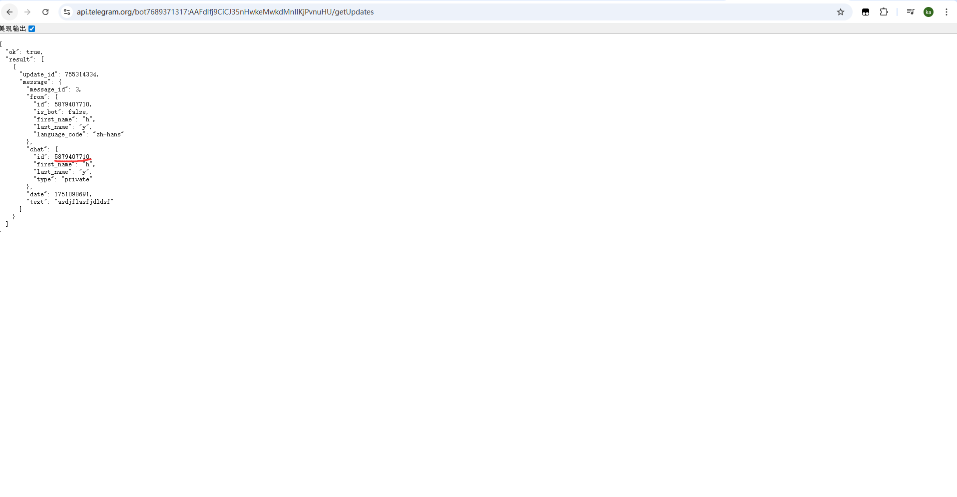 浏览器输入 https://api.telegram.org/bot你的机器TOKEN/getUpdates 获取chat_id 如果获取不到就再给机器人发几条消息